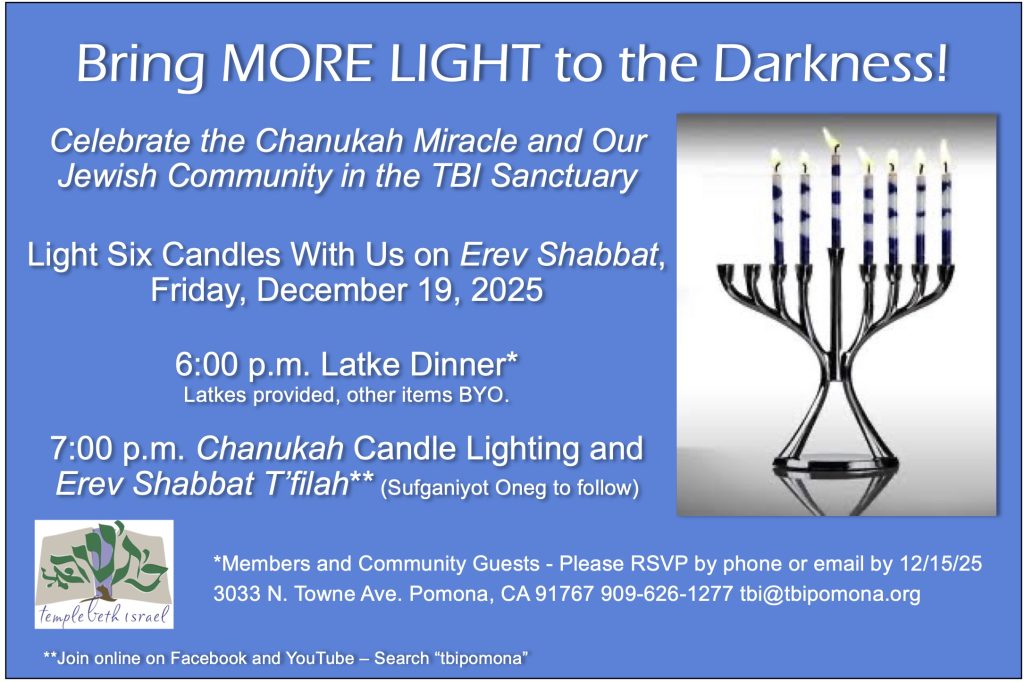 Check out our @TBIPomona Facebook Page where you can get the latest info and view info about our upcoming Shabbat services and other events held online. Our services are archived on Facebook and YouTube.