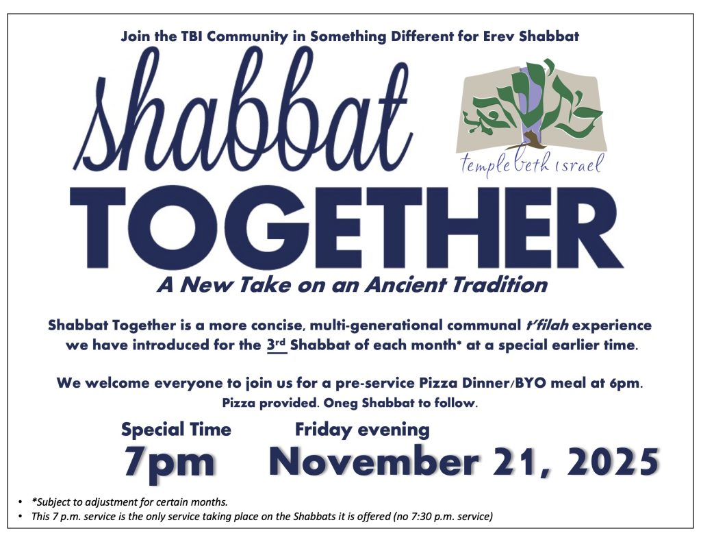 Shabbat Together* – 7:30pm, Sanctuary