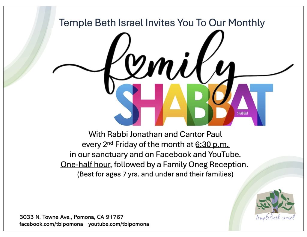 Check out our @TBIPomona Facebook Page where you can get the latest info and view info about our upcoming Shabbat services and other events held online. Our services are archived on Facebook and YouTube.