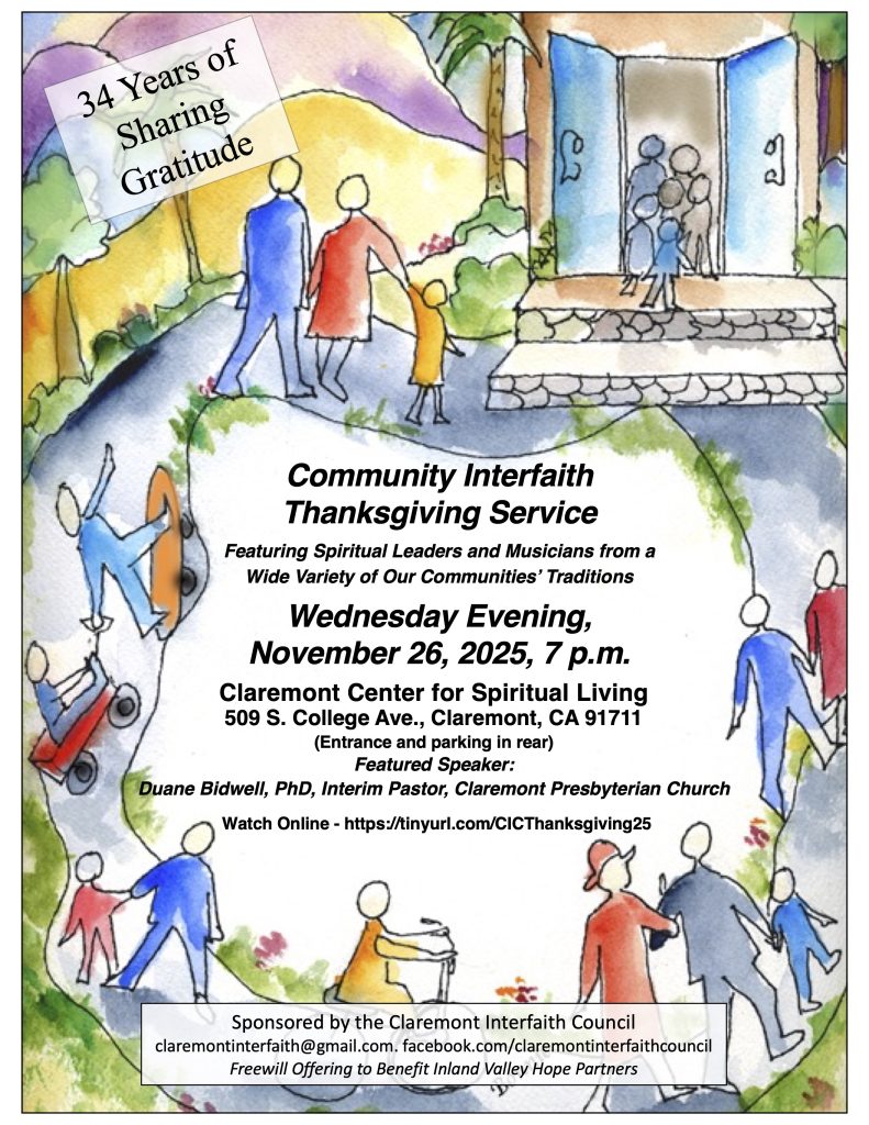 Community Interfaith Thanksgiving Service – 7pm, Claremont Center for Spiritual Living (Learn more)