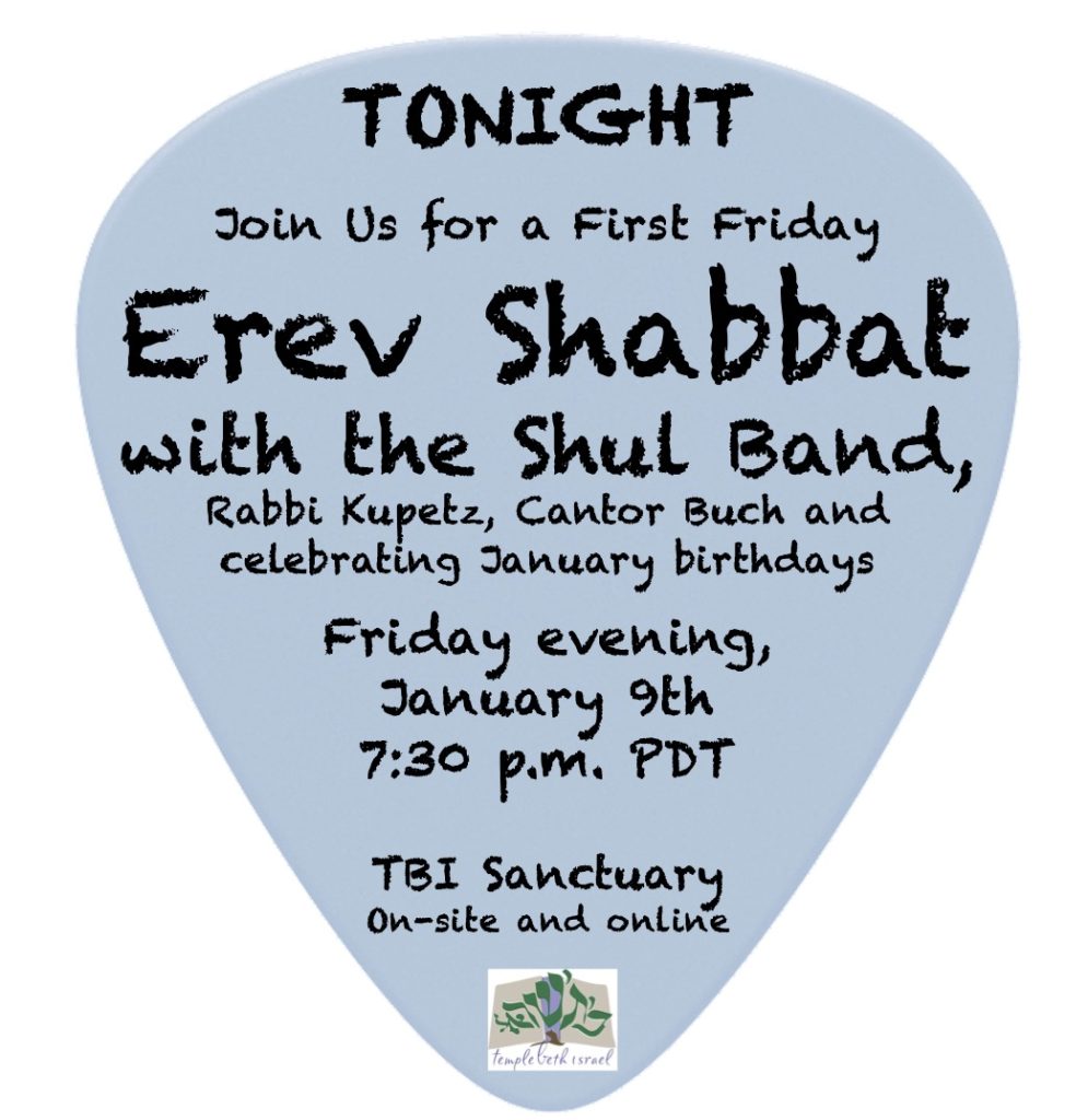 Erev Shabbat Service* – 7:30pm, Sanctuary w/Shul Band and celebrating January birthdays.
